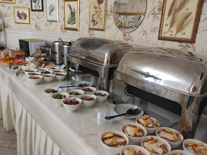 - банкетный зал (Работает круглый год по предварительной записи с 11:00 до 23:00. Кухня: европейская, кавказская. Расположен на втором этаже. Вместимость до 60 человек. ), бар (Караоке бар "Опера", работает круглый год по предварительной записи с 11:00 до 23:00. Кухня европейская, кавказская. ), кафе (Летнее кафе «Шатер» Работает с 11:00 до 23:00 (с мая по сентябрь). Кухня: кавказская, русская, европейская. Расположение: летняя площадка возле отеля, у входа в парк.), 2 ресторан («Прованс» - обеденный зал, где питаются отдыхающие. Завтрак - с 08:00 до 10:30, обед - с 13:00 до 14:30, ужин - с 17:30 до 18:30. Кухня: русская, европейская, диетическое меню. Расположен на втором этаже. ; Ресто-паб «Хмель». Работает с 11:00 до 23:00 ежедневно. Кухня: немецкая, европейская, кавказская. Расположение: на первом этаже.)