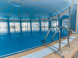 - детский бассейн (В крытом бассейне предусмотрена зона для купания детей до 14 лет. Посещение разрешено строго с 4 лет. Дети с 4 до 14 лет могут находиться в воде только под наблюдением родителей). Бесплатно: крытый бассейн (Диаметр бассейна — 22,5 м. Оборудован каскадным душем, восходящим душем и гидромассажной установкой. В зоне отдыха установлены шезлонги. Специальное оборудование позволяет войти в бассейн людям с ограниченными возможностями. Посещение бассейна назначается врачом в размере 1 часа (60 мин.) в день. Ежедневное посещение аква-зоны с 08:30 до 20:30 (санитарно-технический перерыв 12:30-15:00))