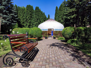 - Есть огороженная территория. Площадь всей территории "Казахстана" более 7 га, из них большая часть приходится на зону для прогулок и отдыха. Зелёный парк санатория имеет большой успех у отдыхающих, так как богат восточной и южной флорой. Восточный колорит имеет место быть и в изящной купольной крыше бассейна.