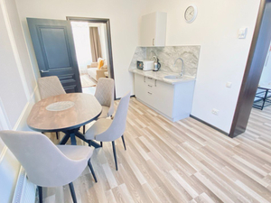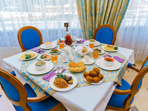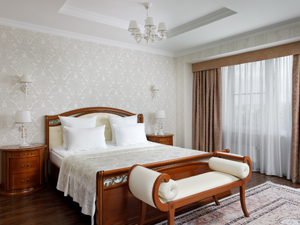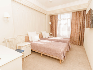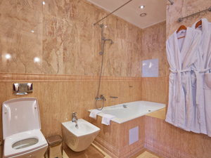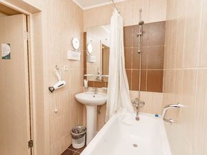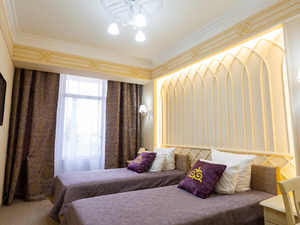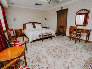 Сервис: Уборка номера ежедневно, смена белья - раз в 5 дней, смена полотенец - по требованию, каждый день в номерах категории «люкс» и «апартамент», раз в 3 дня в номерах «комфорт» и «улучшенный».1-местный стандарт 1 категории (макс. 1 чел., 15 кв. м, центральное кондиционирование, ванна, фен, халаты, тапочки, холодильник, балкон (в части номеров), электрочайник, сейф, 1,5-спальная кровать, санузел).2-местный стандарт 1 категории (макс. 2+1 чел., 15 кв. м, телевизор, центральное кондиционирование, ванна, фен, халаты, тапочки, холодильник, балкон, электрочайник, сейф, 2-спальная кровать, набор посуды, санузел). Доп. место - еврораскладушка.2-местный 2-комнатный люкс (макс. 2+2 чел., 39,5 кв. м, телевизор, центральное кондиционирование, ванна, фен, халаты, тапочки, холодильник, балкон, электрочайник, сейф, мягкая мебель, 2-спальная кровать, набор посуды, санузел, гостиная 13,5 кв. м; спальная комната 13,5 кв. м; прихожая 7 кв. м; объединенный санузел 5,5 кв. м). Доп. место - диван, может быть установлен без ограничения по возрасту.2-местный 3-комнатный люкс (макс. 2+2 чел., 46 кв. м, телевизор, центральное кондиционирование, ванна, фен, халаты, тапочки, холодильник, балкон, электрочайник, сейф, мягкая мебель, 2-спальная кровать, набор посуды, санузел, гостиная 14,5 кв. м, спальная комната 12,5 кв. м, столовая зона 12,5 кв. м, прихожая 6 кв. м, объединенный санузел 7 кв. м). Доп. место - диван, может быть установлен без ограничения по возрасту.2-местный 4-комнатный люкс (макс. 2+2 чел., 100 кв. м, центральное кондиционирование, душ, фен, халаты, тапочки, холодильник, балкон, СВЧ печь, сейф, мягкая мебель, 2-спальная кровать, 1,5-спальная кровать, набор посуды, санузел, 2 телевизора, кухонный уголок, гостиная - площадь 26 кв. м, спальная комната 25,5 кв. м, кухня 5 кв. м, кабинет 13,5 кв. м, комната для охраны 10 кв. м, прихожая 7 кв. м, объединенный санузел 13 кв. м, санузел в комнате для охраны).2-местный 5-комнатный люкс "Президентский" (макс. 2+2 чел., 138 кв. м, центральное кондиционирование, душ, ванна, умывальник, биде, фен, халаты, тапочки, холодильник, СВЧ печь, сейф, мягкая мебель, рабочий кабинет, 2-спальные кровати, обеденный стол, набор посуды, санузел, 2 телевизора, кухонный уголок, гостиная - площадь 41,3 кв. м, спальная комната №1 - 34,2 кв. м, санузел №1 - 11,07 кв. м, кабинет 13,12 кв. м, спальная комната №2 - 24,6 кв. м, санузел №2 - 5,9 кв. м, кухня 7,5 кв. м).