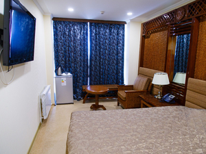 Номер класса "Люкс" в гостинице состоит из просторной прихожей, гостиной с удобными креслами, журнальным столом, спальни с большой кроватью и ванной комнаты, оборудованной душевой кабиной и современной сантехникой. В каждом номере категории люкс есть кондиционер, холодильник, сейф, телефон, вместительный шкаф для одежды, плазменный телевизор и Wi-Fi интернет. Проводится ежедневная влажная уборка номеров.