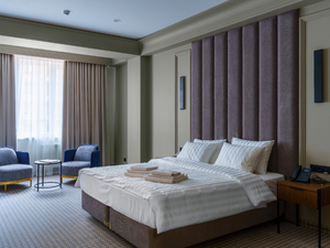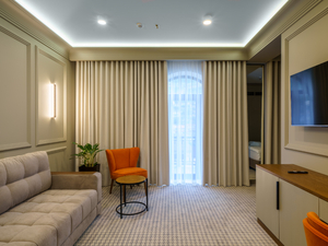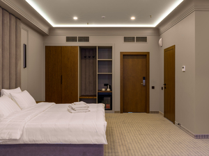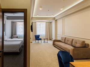 2-местный джуниор сьют (макс. 2+2 чел., 42 кв. м, Wi-Fi, телевизор, сплит-система, душ, фен, балкон (в части номеров), электрочайник, сейф, телефон, 1-спальные/ 2-спальная кровать, кресло, прикроватные тумбочки, шкаф, зеркало, вешалка для одежды, мини-холодильник, туалет, чайный набор, полотенца, диван-кровать). Доп. место - диван-кровать/кровати.