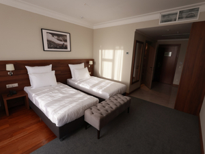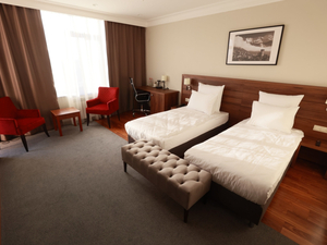2-местный стандарт TWIN (макс. 2 чел., 33 кв. м, сплит-система, душ, фен, тапочки, туалетные принадлежности, мини-бар, сейф, рабочий стол, 1-спальные кровати, журнальный столик, шкаф, мини-холодильник, чайник, набор для приготовления чая или кофе, туалет, ковровое покрытие).