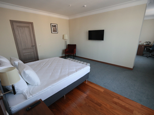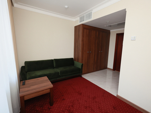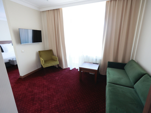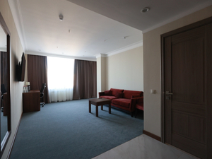 2-местный 2-комнатный полулюкс (макс. 2+1 чел., 42 кв. м, сплит-система, душ, фен, тапочки, туалетные принадлежности, мини-бар, сейф, рабочий стол, журнальный столик, шкаф, мини-холодильник, чайник, набор для приготовления чая или кофе, туалет, 2-спальная кровать "king-size", ковровое покрытие). Доп. место - диван, по запросу возможно установить второе доп. место для ребенка 5-14 лет.
