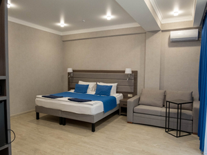 2-местный стандарт, корп. 12 (макс. 2+1 чел., 26 кв. м, Wi-Fi, телевизор, фен, 1-спальные/ 2-спальная кровать, шкаф, мини-холодильник, санузел). Доп. место - софа.2-местный 2-комнатный люкс (вид на море), корп. 12 (макс. 2+2 чел., 70 кв. м, Wi-Fi, телевизор, фен, 2-спальная кровать, шкаф, мини-холодильник, санузел). Доп. место - диван.Коттеджи