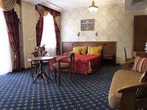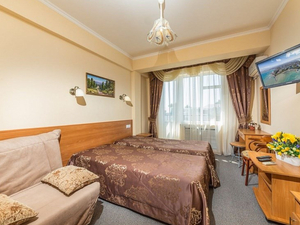 2-местный 2-комнатный люкс (макс. 2+2 чел., 27 кв. м, телевизор, центральное кондиционирование, холодильник, балкон, электрочайник, сейф, телефон, 2-спальная кровать, душевая кабина, санузел, посуда). Доп. место - диван, может быть установлен без ограничения по возрасту.
