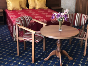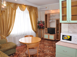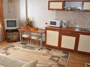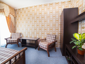 2-местный 2-комнатный люкс с кухней (макс. 2+2 чел., 25 кв. м, телевизор, кондиционер, душ, холодильник, балкон, кухня/мини-кухня, электрочайник, сейф, телефон, 2-спальная кровать, санузел, посуда). Доп. место - диван, может быть установлен без ограничения по возрасту.