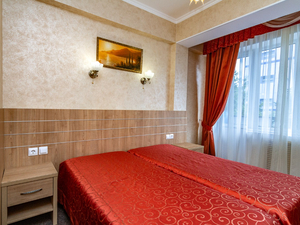 2-местный 2-комнатный повышенной комфортности (макс. 2+2 чел., телевизор, кондиционер, холодильник, балкон, электрочайник, сейф, 1-спальные/ 2-спальная кровать, санузел, посуда). Доп. место - раскладной диван, может быть установлен без ограничения по возрасту.