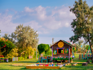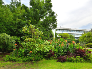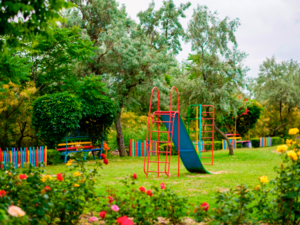 - Есть огороженная территория. Территория представляет собой зелёный рукотворный парк, с цветниками и розариями.