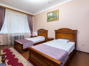 Сервис: Уборка номера ежедневно, смена белья - по требованиюСтандарт двухместный (две раздельные кровати) (макс. 2 чел., 30 кв. м, Wi-Fi, ЖК/LCD телевизор, кондиционер, фен, халаты, тапочки, холодильник, банные принадлежности, сейф, телефон, шкаф/гардероб, стул, 1,5-спальные кровати, тумбочка, журнальный столик, зеркало, вешалка для одежды, раковина, мини-холодильник, душевая кабина, туалет, теплый пол, набор посуды для приготовления чая и кофе, питьевая вода, туалетный столик, банные полотенца, настольные лампы, цифровое телевидение, вид на город, мебельный гарнитур, обслуживание номеров, гигиенический душ, кулер на этаже, Несмотря на то, что номер называется стандартным, он включает в себя все возможные опции для комфортной работы и отдыха. Одна комната без балкона, две раздельные кровати по 1,2 метра шириной.).Комфорт с двуспальной кроватью (макс. 2 чел., 35 кв. м, Wi-Fi, ЖК/LCD телевизор, кондиционер, душ, фен, халаты, тапочки, банные принадлежности, лоджия, сейф, телефон, шкаф/гардероб, стул, 2-спальная кровать, кресло, тумбочка, журнальный столик, зеркало, вешалка для одежды, раковина, мини-холодильник, чайник, душевая кабина, туалет, чайный набор, теплый пол, туалетный столик, пуф, банные полотенца, электронный замок, настольные лампы, багажная тумба, питьевая бутилированная вода, цифровое телевидение, вид во двор, обслуживание номеров, гигиенический душ, кулер на этаже, Номера состоят из комнаты и веранды. В каждом номере одна двуспальная кровать, мебель высокого класса, предрасполагающая как к отдыху, так и к работе.).Люкс (макс. 2+1 чел., 80 кв. м, Wi-Fi, ЖК/LCD телевизор, кондиционер, фен, халаты, тапочки, банные принадлежности, лоджия, сейф, телефон, мягкая мебель, шкаф/гардероб, стул, 2-спальная кровать, диван, тумбочка, журнальный столик, зеркало, вешалка для одежды, раковина, мини-холодильник, чайник, душевая кабина, письменный стол, туалет, чайный набор, гостиный уголок, теплый пол, питьевая вода, туалетный столик, банные полотенца, электронный замок, настольные лампы, багажная тумба, два телевизора, цифровое телевидение, мебельный гарнитур, обслуживание номеров, гигиенический душ, кулер на этаже, Трехкомнатный номер, спальня, рабочий кабинет, гостиная закрытая веранда. Дополнительные опции для отдыха и работы позволяют максимально использовать время. Огромная веранда позволит не только отдохнуть от работы, но и насладиться прекрасными видами из окон гостиницы.).