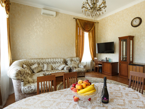 2-местный люкс улучшенный (макс. 2+1 чел., 55 кв. м, Wi-Fi, телевизор, кондиционер, фен, халаты, тапочки, мини-бар, сейф, телефон, 2-спальная кровать, шкаф, зеркало, стол, вешалка для одежды, чайник, стулья, чайный набор, полотенца, вид на город). Доп. место - диван.