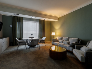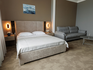 2-местный джуниор сьют, корп. 2 (макс. 2+1 чел., 29 кв. м, Wi-Fi, телевизор, кондиционер, ванна, фен, халаты, тапочки, холодильник, туалетные принадлежности, 2-спальная кровать, кресло-кровать, чайник, чайный набор). Доп. место - кресло-кровать / диван, может разместиться только ребенок, наличие доп. места не во всех номерах, необходимо запрашивать у отеля!.