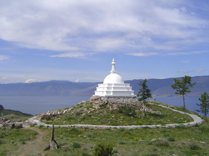 Буддийская ступа, возведенная на острове Огой летом 2005г, официально именуется как ступа Просветления, Покорения демонов, содержащая статую Женской формы, матери всех Будд. Другими словами, эта ступа относится к типу ступ, в которую вложены различные буддийские реликвии. Остров Огой, протянувшийся узкой извивающейся полосой суши с юга на север на 6 км, с воздуха сильно напоминает танцующую богиню Диканю с распростертыми руками, устремленную на север. Ступа, сооруженная на самой высокой отметке острова (512 м), на высоте 60 метров над уровнем Байкала оказалась расположенной как раз в области сердца острова. В строительстве ступы принимали участие волонтеры из разных мест: Москвы, Санкт-Петербурга, Минска, Екатеринбурга, Иркутска, Нью-Йорка, Лондона, Лиссабона. Все необходимое для строительства перебрасывали на катерах и потом вручную поднимали на вершину, а наиболее тяжелые грузы – на вертолетах. Проект ступы разработан иркутским архитектором. Строительством руководил лама из Бутана.
