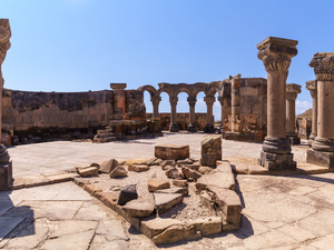 - И завершится поездка посещением руин храма Звартноц, что в переводе означает «сонм небесных воинов» или «храм Бдящих Ангелов». Храм был возведен еще в VII ст. Как и большинство древних сооружений Армении, Звартноц дошел до настоящего времени только в развалинах. Но даже в таком виде он дает яркое представление о своей величественной красоте (Всемирное наследие ЮНЕСКО (лист 2000)).