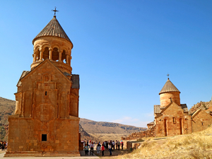 - Далее наш путь лежит по живописному ущелью, окаймленному терракотовыми скалами, к монастырю Нораванк (13 в.). А по дороге к нему нас ждет посещение винного завода Арени и дегустация вин.