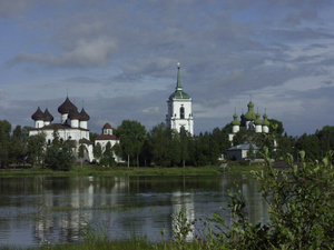 12:00 - Обед в деревне. После обеда продолжаем наше знакомство с Каргопольем - едем в село Архангело, где на левом берегу реки Онеги стоят две деревянные церкви — Архангела Михаила (1715 г.) и Сретения Господня (около 1820 г.). Первая уникальна тем, что завершена кубоватой кровлей, известной только в Поонежье и на прионежском берегу Белого моря. На кубе стоит традиционное пятиглавие. Апсида перекрыта бочкой. Сретенская церковь имеет шлемовидную кровлю с завершением главкой. Храм Сретения Господня относится к типу ярусных храмов (внешний осмотр).