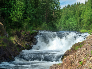 По дороге остановка у водопада Ахинкоски. Это очень живописное место, водопад впадает в небольшое закрытое со всех сторон высокими берегами озеро, с разных берегов которого открываются различные виды на водопад.