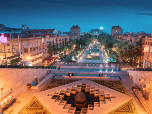 - В 19:00 снова встреча с гидом для пешей прогулки по вечернему Еревану. Вас ждут интереснейшие рассказы о тысячелетней истории столицы наряду с осмотром архитектурных памятников (такие как здание Оперы, комплекс Каскад, здание Национального собрания, площадь Республики), а также винтажных центральных улиц города (такие как ул. Абовяна, пр. Маштоца, пр. Баграмяна, Северный проспект). А с высоты смотровой площадки вашему взору откроется весь город.