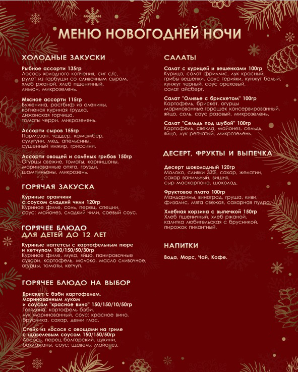 Взрослый тариф - от 18 лет (включая меню, новогоднюю программу и алкоголь - 1 бутылка на человека)